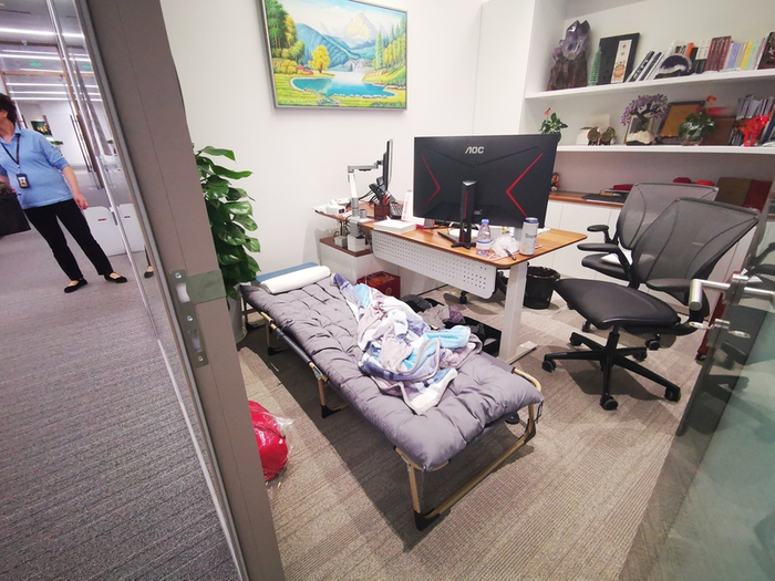 几张临时床铺搭在会议室里,用几个长凳拼成。有人干脆把行军床放在了电脑桌边上,起床就工作,下班就上床。