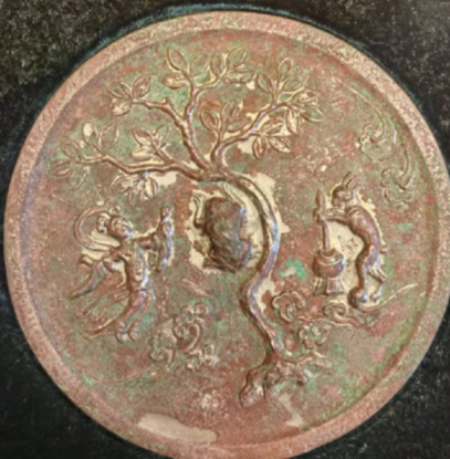 镜中央为一株枝叶茂盛,盘根错节的桂树,桂树是《山海经》中记载的神树,树干右侧绕过镜钮生长。镜钮为一只象征着财富的蟾蜍,右侧为一只灵动站立的玉兔,该兔双耳竖起,前肢执杵呈捣药状,左侧为翩翩欲飞的嫦娥,嫦娥头梳高髻,眉目清秀,双臂开张,衣袂飞扬,似升似腾,婉若惊鸿;树根周围及镜的边缘漂浮着朵朵祥云。整个画面动静相宜,和谐自然,生动美妙。