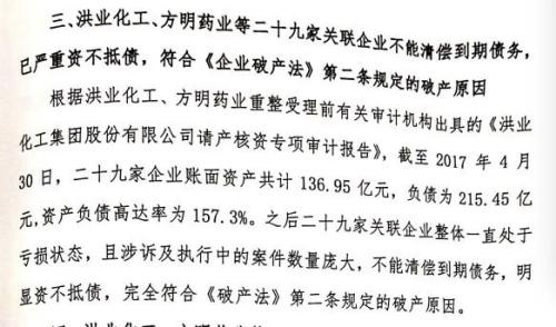 同年8月,菏泽中院裁定济南环周律师事务所、北京中银律师事务所分别担任洪业化工、方明药业的破产管理人。随后的9月28日,菏泽中院再次裁定洪业化工等29家企业合并重整。