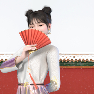 “文夭夭”取名自《诗经·周南·桃夭》:“桃之夭夭,灼灼其华”,造型融合中国传统文化和现代元素于一身:双丸子头源自古代少女发型,后部增加现代编发;妆容融入唐代盛行的花钿装饰,配以红白交叠的眼影,透出年轻与古典交织的气息;服装采用现代莫兰迪色系,以“古代扇子”为贯穿元素,运用大量百褶元素在底纹、袖口等细节,并取谐音“善”,寓意人物性格善良单纯;服装材质采用科技流光,营造虚拟时装感;腰间所系熏球,造型源自葡萄花鸟纹银香囊。