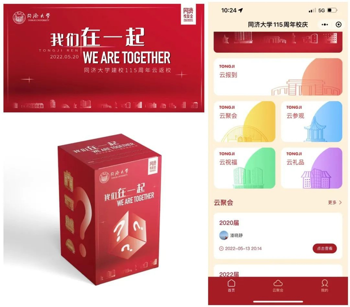 面对疫情,虽然我们不能相聚于校园,但是同济人始终在一起。“云返校”是以微信小程序为载体,设有“云报到”“云聚会”“云参观”“云祝福”“云礼品”等面向校友的线上互动活动。