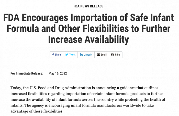 此外,FDA还将为美国婴儿奶粉出口企业提供灵活性,包括呼吁企业向其提交信息进行产品快速评估,以寻求进一步增加美国本土产品的供应量。