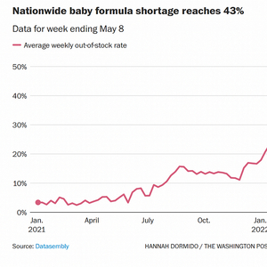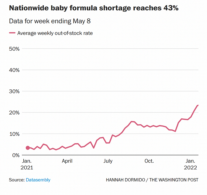 根据多家外媒引用的Datasembly数据,截止当地时间5月10日,美国婴儿配方奶粉供应量仅为正常水平的56%。但FDA专员Robert. M Califf则在采访中称这一数据“不正确”,IRI数据显示库存量是接近80%。