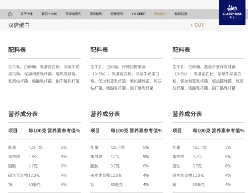 卡士官网也在品牌整体介绍中提到自己是100%生牛乳发酵。而双倍蛋白系列酸奶虽添入乳清蛋白粉和浓缩牛奶蛋白粉,可4.7-4.8克左右的蛋白质含量却不如自家未使用蛋白粉的的YOU KEEP系列——后者的原生乳蛋白含量高达9克。