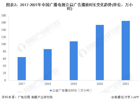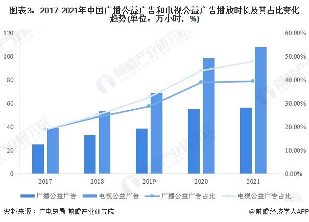 其中公益广告市场表现最为亮眼,2017年,全国公益广告播出总时长仅63.93万小时,占全国广播电视广告播放时长的18.7%,到2021年,全国公益广告播出总时长增长至164.46万小时,占全国广播电视广告播放时长的44.5%.
