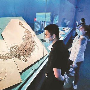 ▲5月17日下午,市民在深圳博物馆历史民俗馆参观在云南出土的奇异滤齿龙化石。 深圳晚报记者 余海洪 摄