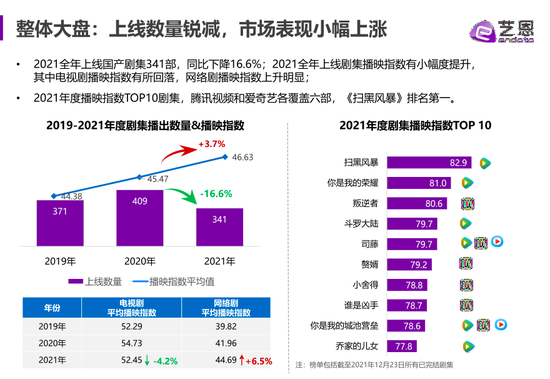 相关部门公布的信息显示,2021年全国电视剧备案共498部16485集,较上年分别下降25.7%、29.9%,创近年来备案数量新低。艺恩数据显示,2021全年上线的国产剧集341部,同比下降16.6%。
