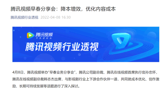 今年4月8日,腾讯视频举办了一场“降本增效”为主题的业务分享会。会上腾讯视频提出,接下来将对平台旗下自制、定制、版权等类型的内容生产要素成本进一步规范化、合理化,通过有效且落地的措施,确保成本可控,抑制生产链条上不合理的虚高价格,挤掉泡沫。