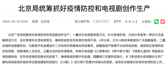 4月以来,北京广电局为已为14部送审剧提供了无接触服务。近期还为《情满九道弯》《心想事成》《梦中的那片海》等剧组协调拍摄场地,在符合疫情防控要求的前提下,确保剧组如期开机拍摄。