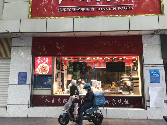 5月18日下午,短短半小时,澎湃新闻记者看到山林大红汇联商厦店门前取单的外卖小哥一个接一个,从窗口把纸袋包好的套餐放入配送箱。店铺里,新订单也陆续摆上柜台。