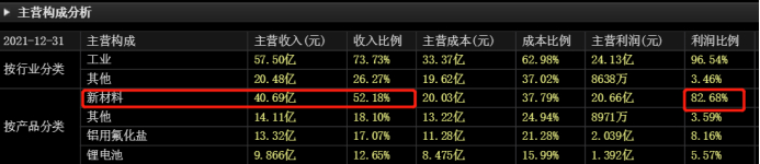 若以产品类别为准,多氟多的主营业务包括新材料、铝用氟化盐、锂电池及其他。其中,新材料在主营收入中的占比最大,超过5成。而若从利润比例来看,新材料占比则高达近83%。具体来看,新材料所涉及的主要产品包括六氟磷酸锂及新型电解质和电子化学品等。