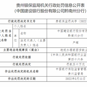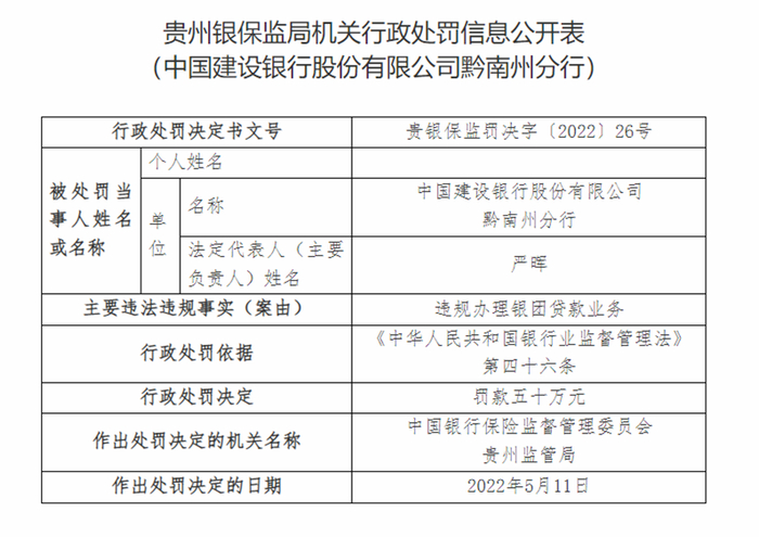 建设银行黔南州分行因违规办理银团贷款业务被罚款50万元。该行姜钧是上述违法违规行为负领导责任的直接责任人,被罚款5万元。