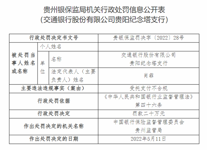 交通银行贵阳纪念塔支行因受托支付不合规被罚款20万元。该行胡蓓是上述违法违规行为负管理责任的直接责任人,被罚款5万元。