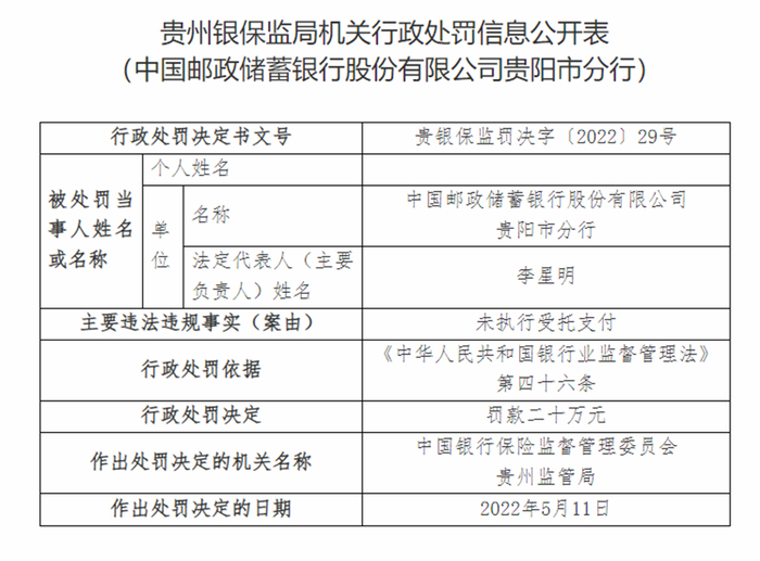 邮储银行贵阳市分行同样因未执行受托支付,被罚款20万元。