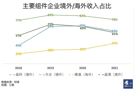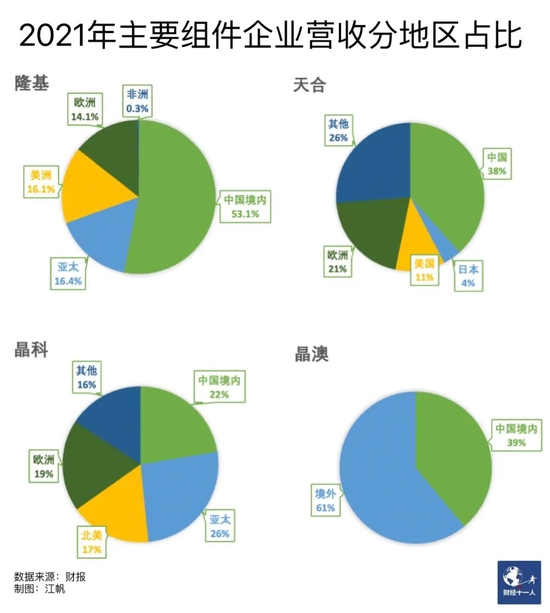面对多地开花的海外市场,组件巨头的全球化布局至关重要。得益于较早开展业务,三巨头建立起了较为完善的全球化销售网络,为开拓渠道奠定基础、加深壁垒,有效减轻对个别市场过度依赖。2021年,三巨头海外收入占比均在60%以上,明显高于以国内市场为重心的隆基。