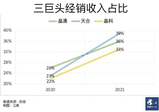 天合2020年中回A,是唯一一个没有硅片产能的组件巨头,只有电池、组件两端产能。这也是天合盈利能力不如晶澳的主要原因。一位接近天合的知情人士对《财经十一人》表示,天合是轻资产模式的专业化企业,过去几年未大规模投资硅片,整体利润表现确实低于一体化企业,但高于同模式企业。2022年,硅料供需整体依旧偏紧,天合还将承压一年。