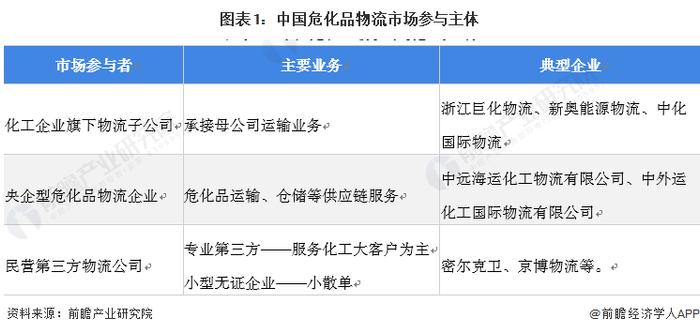 危化品物流市场的主要参与者有三类:化工企业下的物流子公司、央企型危化品物流企业和民营第三方物流公司。
