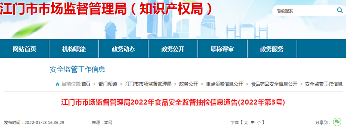中国质量新闻网讯 近日,广东省江门市市场监督管理局发布2022年食品安全监督抽检信息通告(2022年第3号)。