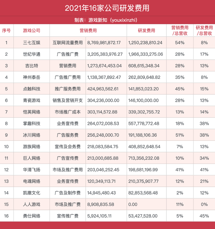 根据上述统计的数据可知,像吉比特、青瓷游戏、点触科技这样研发能力算是比较优越的公司,依然需要大量的营销支出将游戏推向市场,而他们的营销费用也高于研发的支出。