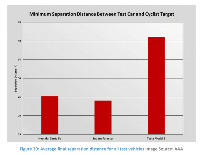 幸运的是,自行车在横向距离上与测试车相隔3.2英寸,因此没有发生碰撞。但这在真实环境中无疑是存在危险的,违反了相关法规的间隙规定。