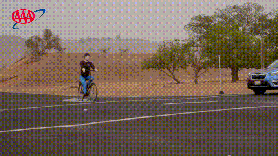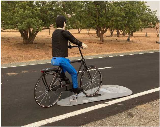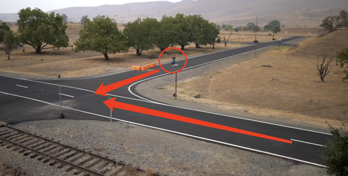 自行车假人这次要横穿测试车车道,所以被放置在距离交叉口横向100英尺开外(下图)。