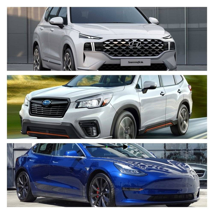 从上到下分别是现代圣达菲、斯巴鲁森林人、特斯拉Model3。这些并非真实测试车,仅供车型参考