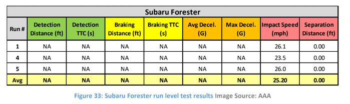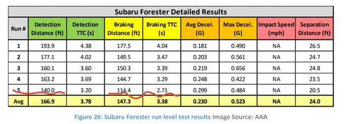 不过,斯巴鲁森林人虽然检测到前车,但从数据来看,启动刹车最晚,因此相比之下刹车会相对猛烈一些。