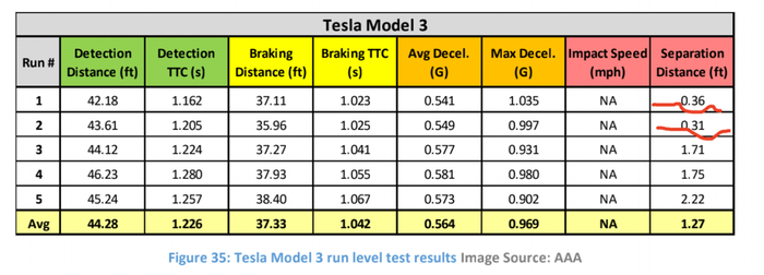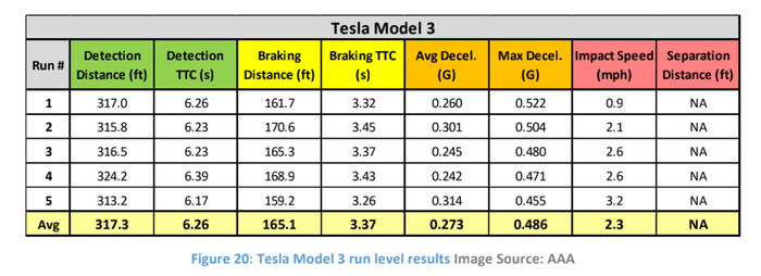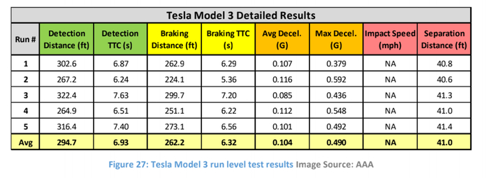 不过,虽然Model3的平均检测距离为317.3英尺,但平均2.89秒后才启动刹车。这与其在A1场景中的表现差距较大——在检测到车辆后平均0.42秒就开始刹车。
