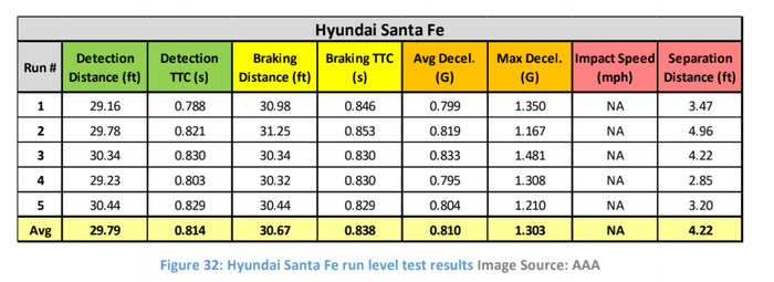 测试结果显示,现代圣达菲的5次测试都表现不错——全部检测到目标,并立即启动紧急刹车。