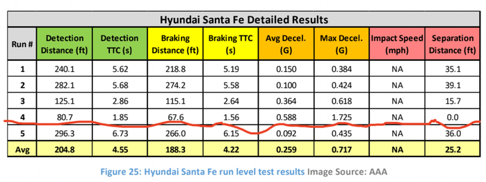 现代圣达菲在5次测试中的三次表现良好——检测与启动刹车系统之间保持了足够距离,司机有充分时间被通知。然而,在第3次、第4次的测试中发生了“意外”: