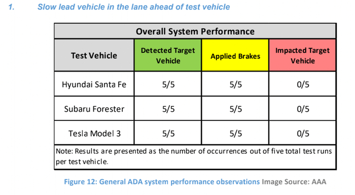 值得注意的是,没有一辆车在15次测试中提供AEB(自动紧急刹车)警告,AAA认为,这表明所有ADAS系统均对目标车辆做出了适当响应;