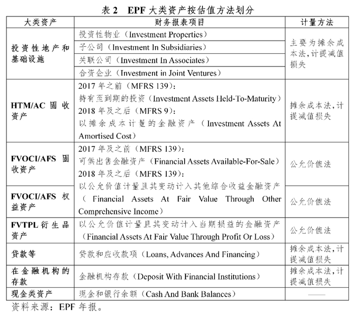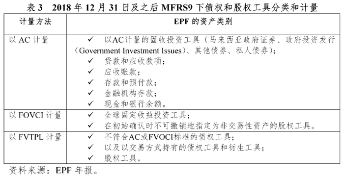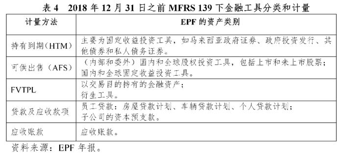 二是2018年12月31日之前MFRS139的金融资产计量方法。根据MFRS139,EPF按照投资意图将金融资产分为:持有到期金融资产(Investment Assets Held-To-Maturity,HTM)、可供出售金融资产(Financial Assets Available-For-Sale,AFS)、以公允价值计量且其变动计入当期损益的金融资产(Financial Assets At Fair Value Through Profit Or Loss,FVTPL)、贷款和应收款项、应收账款5类。其中,对于持有到期(HTM)的金融资产,使用实际利率法以摊余成本法计量。如果持有到期(HTM)的金融资产被出售,则该金融资产所在的整个类别将被重新分类为可供出售(AFS)的金融资产。对于以公允价值计量且其变动计入当期损益的金融资产(FVTPL),其公允价值变动将在损益表中确认。