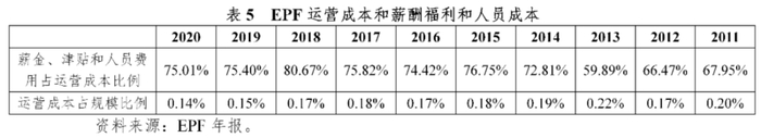 由于员工数量较多,EPF的运营成本一直偏高。EPF拥有4个办事处、68个分支机构,5800多名员工,庞大的组织机构和员工数量带来了较高的人员成本,薪酬福利和人员成本几乎占据了运营成本的6-8成,这也使得运营成本相对管理规模的比例在较长时间内维持在0.17%-0.22%的较高水平。