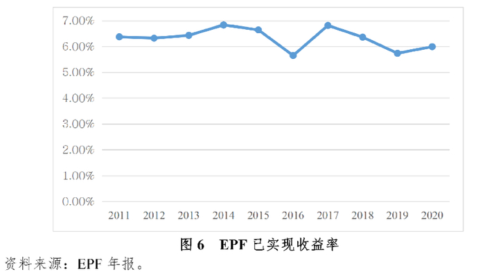虽然为积累制,EPF没有采用净值型而是采用宣布股息率的方式确定雇员个人账户的投资收益。同时,EPF承诺每年至少宣布2.5%的名义股息率,但2010年以来,EPF每年实际向雇员派发了高达5%-7%的股息率。这种做法对于覆盖了马来西亚最广泛人群的EPF来说,有利于照顾到广泛参与者对公积金投资收益稳定的要求,有利于稳定雇员对账户收益的预期,降低投资收益波动对雇员参与积极性的不利影响。
