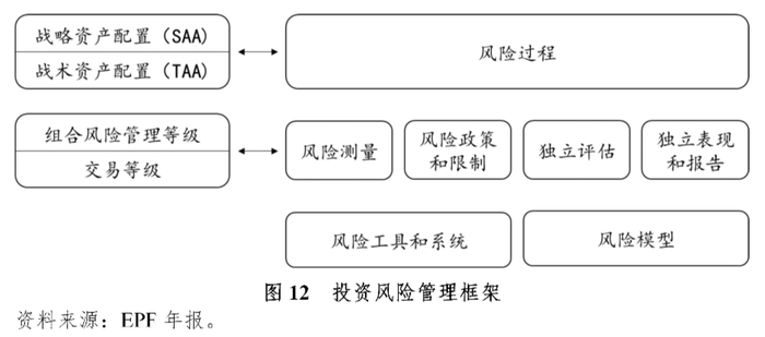 投资风险管理提供了预测和管理投资组合中现有和潜在风险的方法。市场风险方面,EPF通过对所投公司、国家和行业集中度的限制、风险价值(VaR)、久期限制、跟踪误差、收益和波动率的回测、压力测试等方法,定期报告利率、外汇和股票等资产的市场风险,确保风险敞口在EPF风险承受能力之内;信用风险方面,EPF通过信用风险限额(包括公司集中度和交易对手敞口)、信用风险价值(CVaR)、债务人的内部信用评级或违约概率等手段,来防控固收和房地产投资中的信用风险;流动性风险方面,EPF通过每日监控现金流量,预测连续12个月的现金流,将3%的资产配置于现金和短期投资工具,限制公司、行业和资产类型的集中度、监控资产和负债的到期情况等方法来管理。