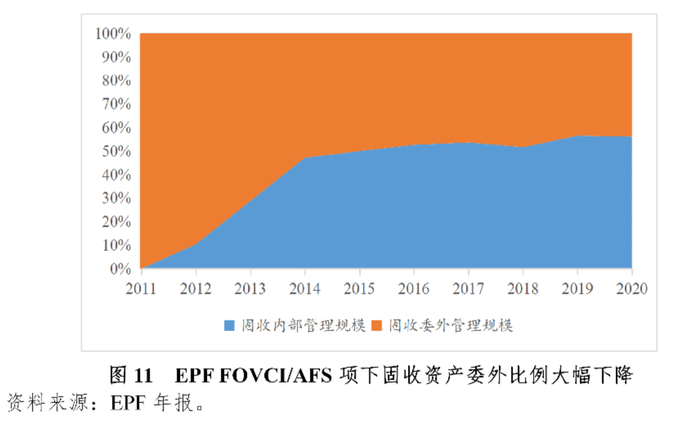 三是自营与委托的投资比例。EPF主要将FVOCI/AFS项下的权益和固收资产委托给外部投资。2011年以来,FVOCI/AFS项下权益资产的委外比例维持在20%上下,但固收资产的委外比例大幅下降,从2011年的100%下降至2020年的43.92%。由于固收资产在FVOCI/AFS项下占比较低,故对合计委外比例的变化影响极小,FVOCI/AFS项下权益固收合计委外比例维持在23%-31%之间。EPF不断提高的内部管理能力是固收委外比例大幅下降的原因:2011年,摊余成本法下的固收资产全部为EPF内部管理,公允价值法下的固收资产基本上全部委外管理;2011年之后,EPF为提升内部管理能力,不断降低公允价值法下的固收资产,故而FOVCI/AFS项下的固收资产过去10年委外占比下降超过一半。