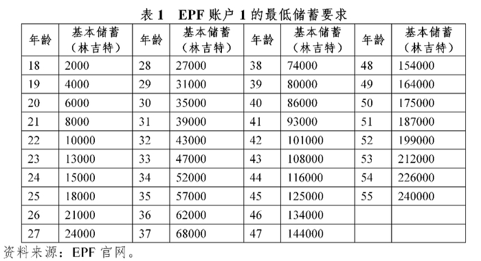 EPF个人账户包括传统账户和伊斯兰教账户两种,后者仅投资于伊斯兰教义资产。雇员在不同年龄拥有不同的账户。55岁之前,EPF个人账户分为账户1和账户2,账户1类似于养老金个人账户,纳入缴费金额的70%,不可提前提取;账户2类似于医保、公积金账户,纳入缴费金额的30%,可提前提取。当账户1余额高于最低储蓄要求(表1)时,雇员每3个月可将部分超额储蓄转移至雇员投资计划(Members Investment Scheme,MIS),由指定的单位信托管理公司和资产管理公司投资以提高收益。年满55岁后,帐户1和帐户2合并为Akaun 55账户,可随时提取;并新增Akaun Emas账户用于缴费。年满60岁后,Akaun 55和Akaun Emas合并,可全部提取。