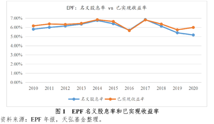 EPF每年根据利润表中的“已实现收益/损失”,即实盈实亏确定名义股息率,并报马来西亚财政部批准。2010-2020年,EPF的名义股息率与已实现收益率较为贴近,仅略低于已实现收益率。EPF名义股息率基本维持在5-7%的水平,远高于EPF承诺的2.5%的水平。