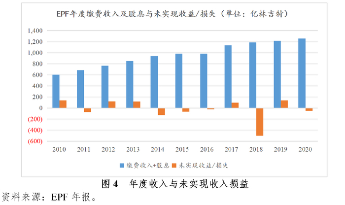 2005年以来,EPF每年缴费收入及股息收入远高于各项领取的总规模,故而EPF目前应对领取的支付和流动性压力不大。值得注意的是,虽然EPF每年的名义股息来源于利润表中的“已实现收益/损失”,即实盈实亏,但EPF资产中还包括“未实现收益/损失”(浮盈浮亏),在考虑流动性压力时,还需考虑浮盈浮亏对EPF资产质量的影响。