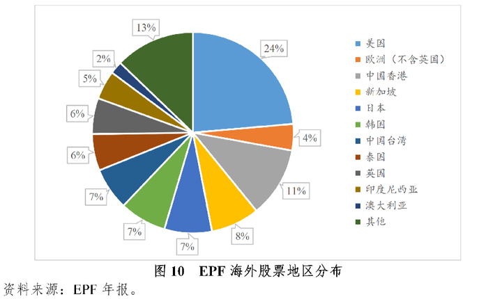 截至2020年,EPF海外股票资产主要投资于美国、欧洲(不含英国)、中国香港、新加坡、日本、韩国等地区。提升海外资产配置比例,有利于EPF分散国内投资风险,尤其是把握海外优质权益资产带来的投资收益。
