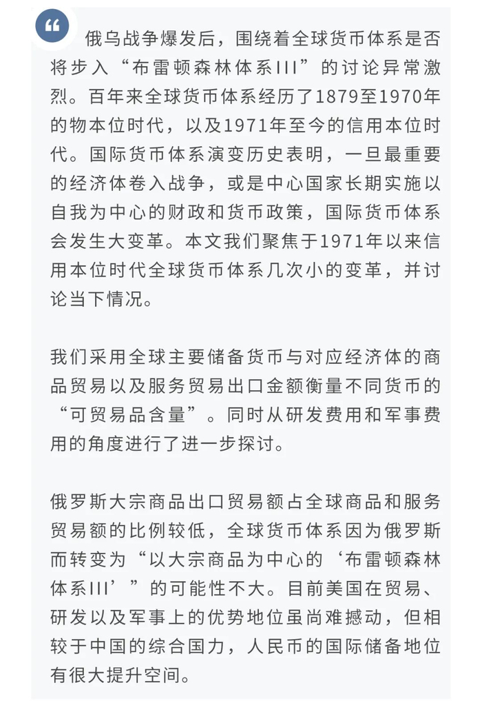 俄乌战争爆发后,围绕着全球货币体系是否将步入“布雷顿森林体系III”的讨论异常激烈。市场讨论的“布雷顿森林体系III”主要是指“以大宗商品为中心的新体系”,该体系将以人民币、卢布和大宗商品生产国货币为中心,可能会进一步削弱欧元和美元的中心地位,推动西方国家通胀水平进一步走高(Pozsar,Z.,2022)。