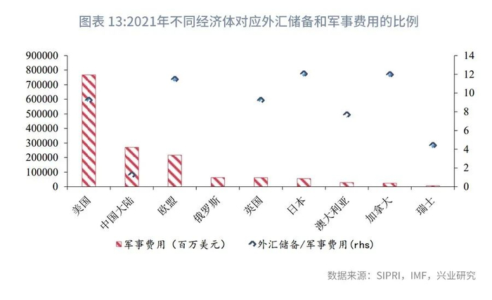 军事费用也是一国实力的重要体现,继石油美元后,军事美元也是美元本位币体系的一大支撑。我们统计了2021年不同币种外汇储备占对应经济体军事费用之间的比例,其中日本、欧盟以及加拿大的比例超过10,分别为12.04、11.46和11.95,美国、英国、澳大利亚的比例也达到9.23、9.22和7.68,瑞士和中国大陆的比例较低,分别仅为4.41和1.24。中国大陆2021年的军事费用达到270亿美元,仅次于美国的768亿美元,排名全球第二,综合实力强劲。多种指标对比下,均显示在这一轮货币体系变革中,人民币具备明显的优势。