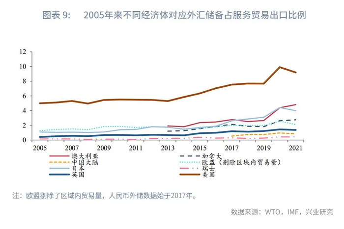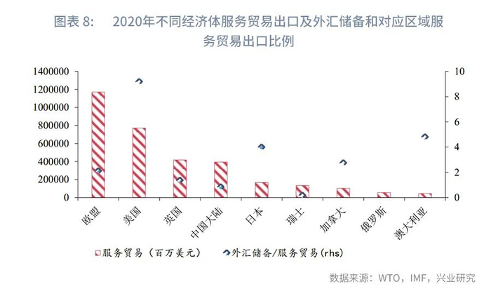 我们统计了2020年不同币种全球外汇储备与对应经济体服务贸易出口金额之间的比例,其中美元占美国服务贸易额的比例最高,达到9.91,其次为日本和澳大利亚,比例分别为4.42和4.40,加拿大、欧盟(剔除区域内贸易量)、英国、中国大陆和瑞士的比例分别为2.63、2.56、1.45、0.97和0.18。中国大陆2020年的服务贸易出口额达到2806亿美元,仅次于美国和欧盟。欧盟(剔除区域内贸易量)、美国在2020年的服务贸易出口额分别为9887亿美元、7056亿美元。