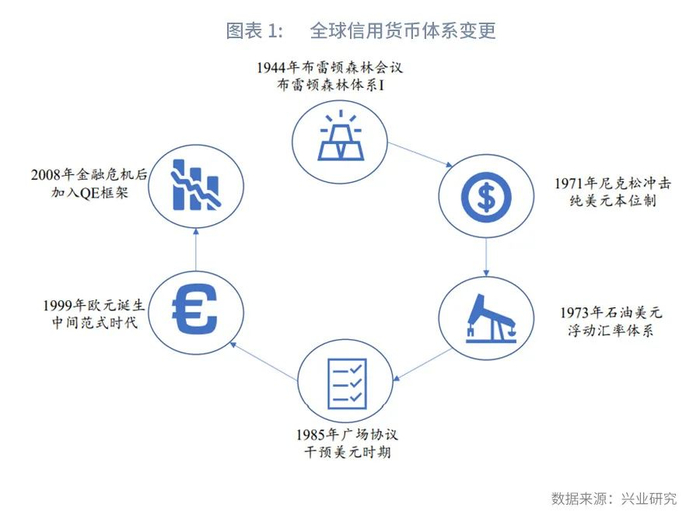 百年来全球货币体系经历了1879至1970年的物本位时代,以及1971年至今的信用本位时代。国际货币体系演变简史表明一旦最重要的经济体卷入战争,或中心国家长期实施以自我为中心的财政和货币政策,国际货币体系才会发生大变革(王晋斌,2010)。在《兴业研究汇率报告:货币含金量与货币体系演变20220410》中,我们已经详细讨论过物本位时代全球货币体系的变革,本文中我们将聚焦1971年以来信用本位下全球货币体系几次小的变革,并讨论当下的情况。