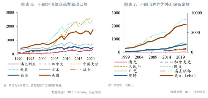 大宗商品贸易只是全球商品贸易中的一部分,以油气燃料、谷类、工业金属、贵金属为代表的大宗商品出口占全球总商品出口的22.54%,占全球商品贸易和服务贸易出口额的17.23%。这使得考虑货币体系的变更,仅考虑大宗商品出口贸易占比显得局限,而应该将关注点拓展至更为广泛的所有商品贸易和服务贸易。一个经济体的对外可贸易品越多,或是说其它经济体对其可贸易品的依赖度越高、不可替代性越强,那么该货币在全球货币体系中的“分量”就越重。从这个角度考量的话可以发现俄罗斯的占比非常有限,但中国在全球外汇储备中的占比相对其贸易体量而言则有很大的提升空间。