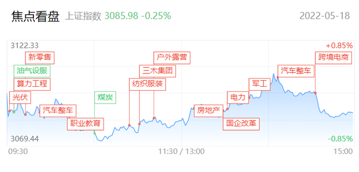 大盘全天围绕平盘附近窄幅震荡,三大指数均小幅下跌。盘面上,题材板块轮番活跃,热点快速轮动。其中户外露营概念股全天强势,三夫户外涨停。服装纺织板块内多股涨停。汽车股再度走强,中通客车4连板。下跌方面,周期类个股表现低迷。总体上个股涨多跌少,两市超2700只个股上涨。虽然指数调整,但个股表现活跃,两市再现超百股涨停。沪深两市今日成交额7703亿,较上个交易日缩量197亿。板块方面,户外露营、服装纺织、教育、非齐次交运等板块涨幅居前,草甘膦、煤炭、机场航运、CRO等板块跌幅居前。
