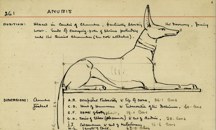 卡特的一张记录卡,上面有他画的阿努比斯(古埃及神话中的死神,以胡狼头、人身的形象在法老的葬墓壁画中出现),并附有注释和尺寸 。 © 牛津大学格里菲斯研究所