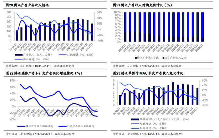 除了社交和游戏基本盘外,腾讯还经营广告及金融科技业务,今年一季度同样表现不佳。