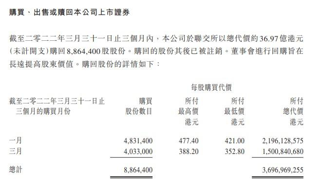 公司一季度回购37亿港元股份 远超去年全年