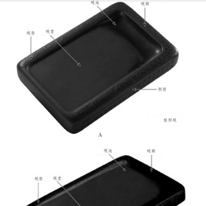 砚台主要部分名称。板形砚(A) 和抄手砚(B),是两种最常见的形制。